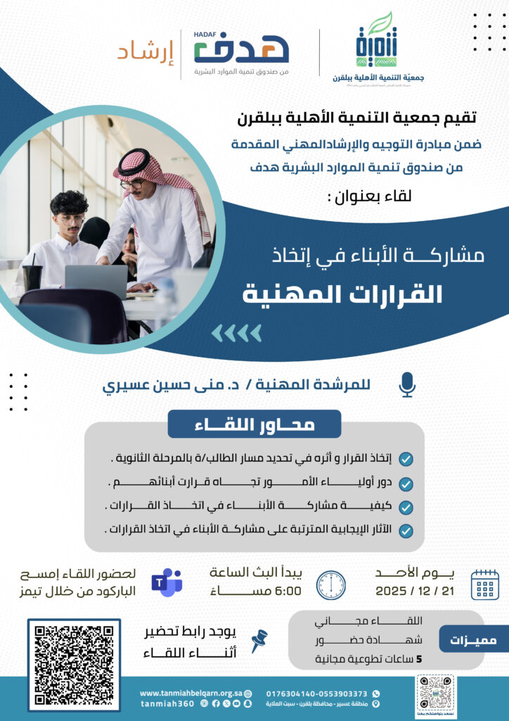| تعلن جمعية التنمية الأهلية ببلقرن ضمن مبادرة التوجيه و الإرشاد المهني المقدمة من صندوق تنمية الموارد البشرية ( هدف ) عن إقامة لقاءً إرشاديًا بعنوان :