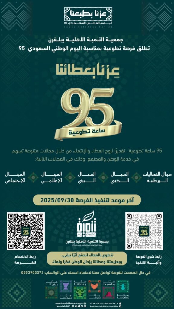 | بمناسبة اليوم الوطني السعودي 95 | تُطلق جمعية التنمية الأهلية ببلقرن فرصة تطوعية مميزة تحت شعار : عِـزنـا بـعـطـائـنـا